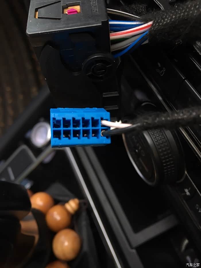 退下原车插头后,注意观察蓝色插头的背面,就是照片所示的位置,上面标有1,6,7,12,根据这些数字判断针脚的顺序,麦克风白色线插端子朝外插1脚,黑色线端子朝外插7脚,插好后复原所有插头。
