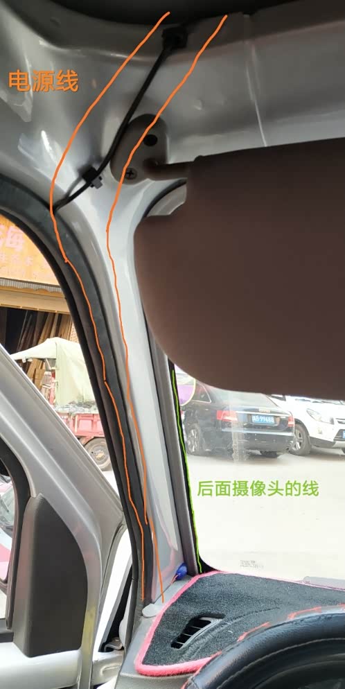 再从挡风玻璃灰色密封条牵到后视镜,我把电源线从点烟器这里走中控台下面埋进黑色密封条再牵到上面的。