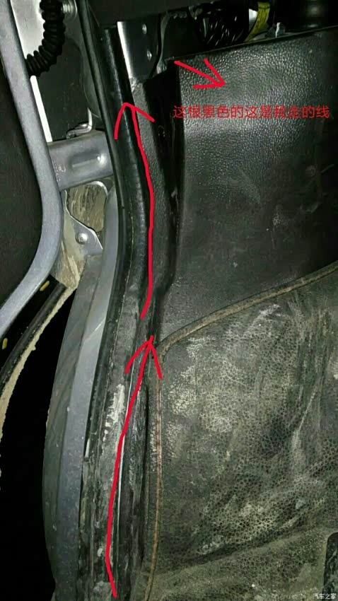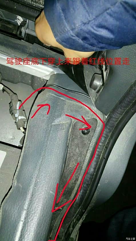 把驾驶座翻开从底下把线牵上来,埋到密封条下面。