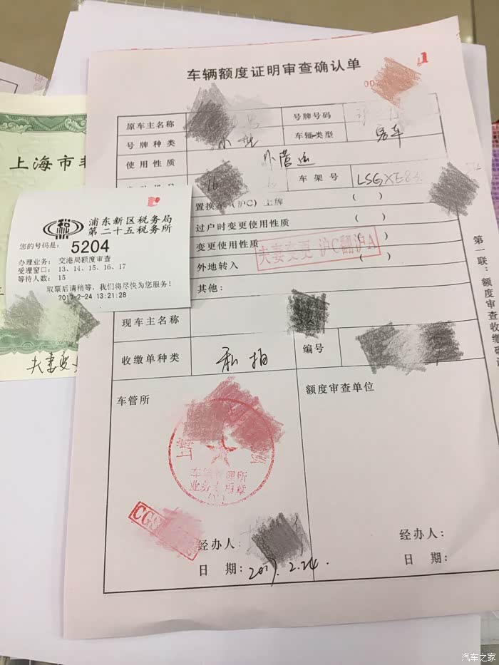 6、去4号楼验额度。进门右拐,告诉领号保安,“办理沪C翻沪牌,夫妻变更,审额度”,领号。听到叫号,到窗口交一套材料,包括:额度证明原件(本人签字后会收掉)及一份两联的额度审核表、双方身份证(原件+1份正反面复印件)、结婚证(原件+1份复印件)、车辆登记证(原件)、行驶证(原件)。验完额度,会退回一份加贴二维码的额度审核表,以及资料原件。