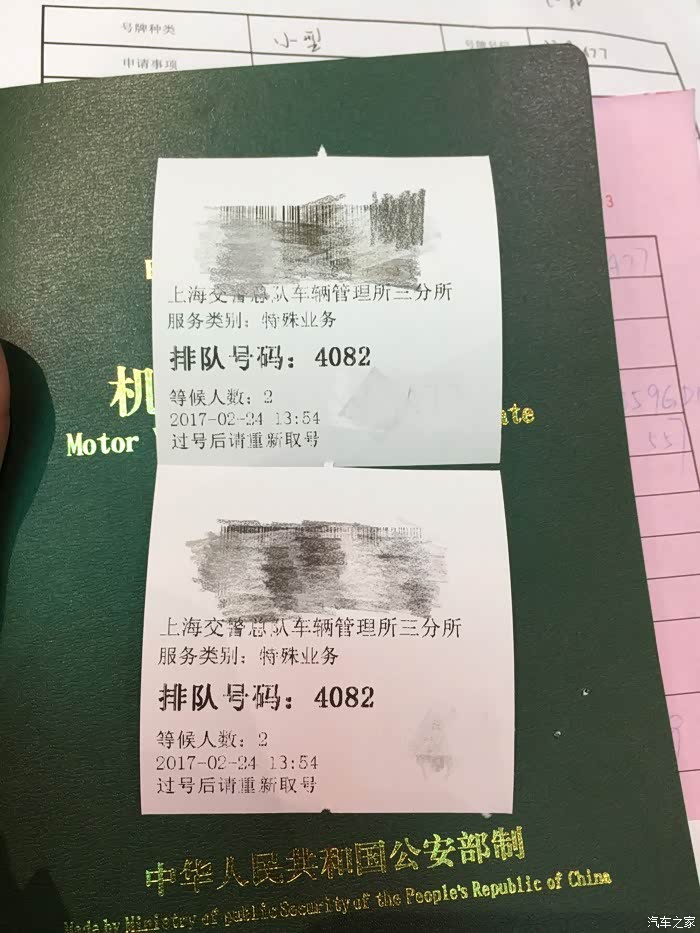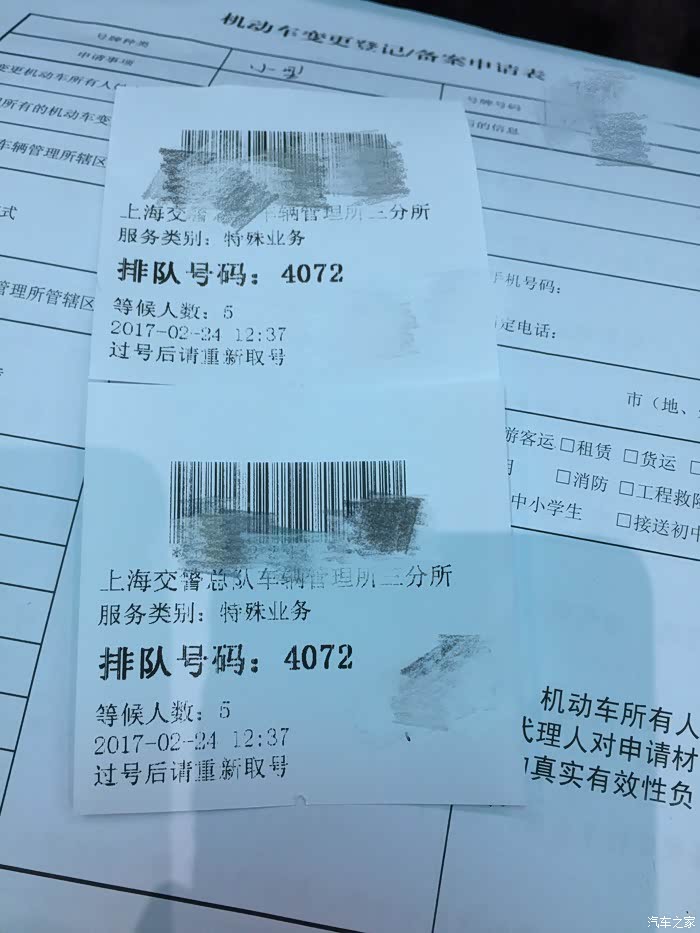 7、重新回到1号楼,进门右侧大柜台二次取号,还是需要向工作人员说明沪是“办理C翻沪牌,车主与额度是同一人,夫妻变更,已经验完额度”。他会给你再打一份2联的特殊业务叫号单。