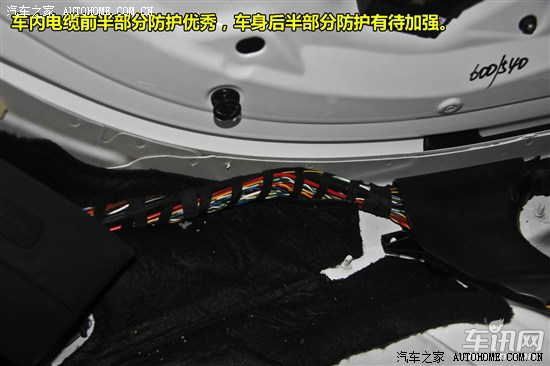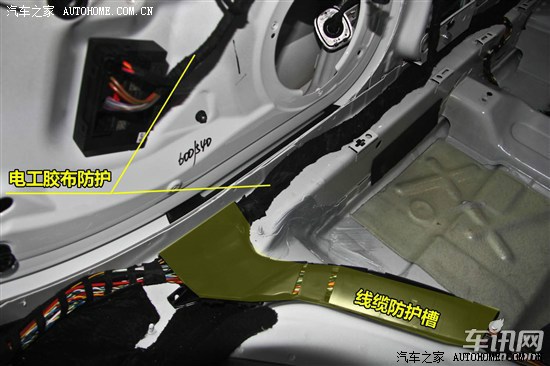 奥迪A4L发动机舱电路、油路、气路管线布局整洁,管线之间的干涉部位使用限位胶皮套、海绵套等进行隔离。大电流电缆使用皮质护套进行防护,小电流电缆采用波纹管保护,点火线圈位置设计专用护套进行布线,直观看不到电缆裸露。进入车内的电缆采用耐磨毛毡布100%防护,车内电缆总线同样使用毛毡布防护,总线后半部分以及分线部分防护相对较差,能够明显看到裸露的电缆。门板电缆以及顶棚电缆防护较为全面。