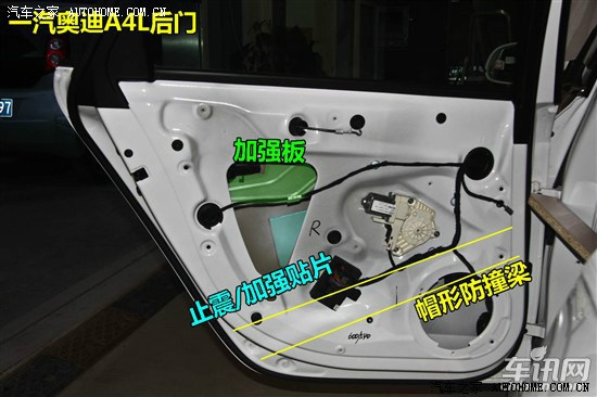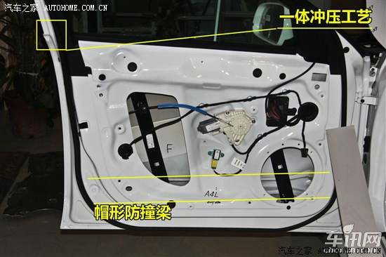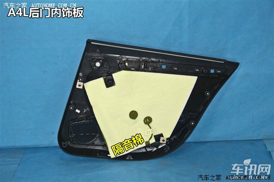 奥迪A4L前门采用双层钢板并使用一体冲压工艺,内饰板内侧填充白色隔音海绵,门板内侧设计一根帽形防撞梁,垂直地面高度为490mm,防撞梁上方贴合金属止震/加强贴片。