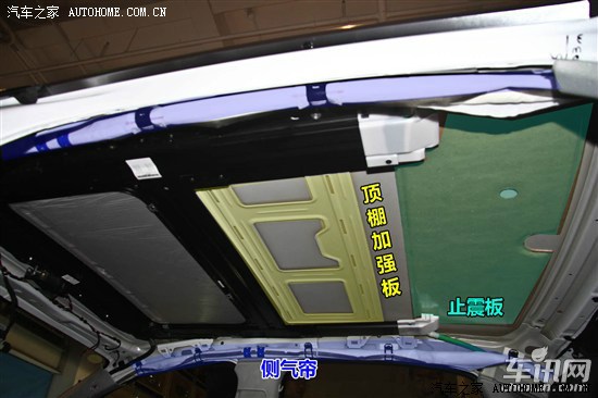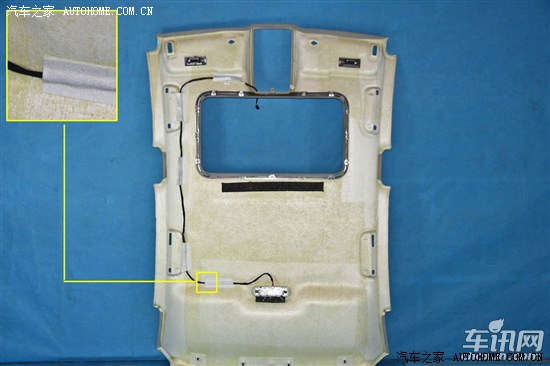 奥迪A4L顶棚内饰板由5层不同材质组成,内饰板内侧无贴合隔热材料,所有线缆均分布在白车身上,电缆保护较为优秀。顶棚采用大面积镂空钢板进行加强,顶棚后方贴合牛皮纸+泡沫材质止震材料,止震板边缘进行闭合密封处理。该止震材料虽为大众车型所常用,从直观和外在表现来看,奥迪所使用的材质优于大众车型。