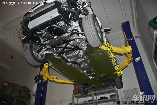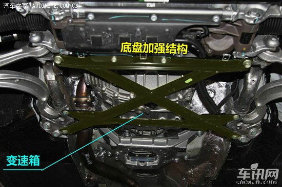 奥迪A4L副车架下方的支撑结构更像是改装车的“井字架”,主要是加强整体结构所设计。除此之外,“井字架”覆盖了发动机以及变速箱等重要部件,也能预防托底情况发生,顺着“井字架”后方仍然可以看到铝合金材质的加强结构件。