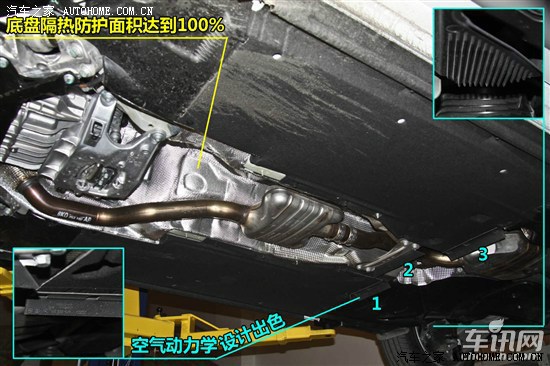 下图中蓝色标注的1、2、3区域专为空气动力学考虑而设计,平整的底盘能够使流经空气更平顺,能够达到节油的目的。或许有些朋友觉得设计师们小题大做,就这么一小点结构,怎么能达到节油的目的呢?这就好比我们把手伸出窗外,当车辆行驶到60公里/小时状态下,风对手的作用力并不大,当提升到100公里/小时以上速度条件下,这时风阻的作用力就非常大了。