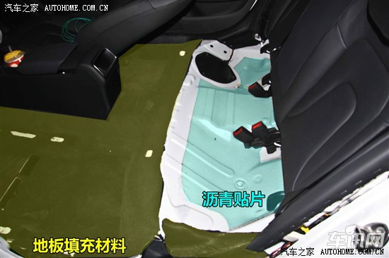 奥迪A4L地板材料由毛毡垫、防潮层以及填充棉三层合一压制而成,整体美观度以及完整度较好,地板材料填充面积约占车内地板的80%,后排座椅下方地板没有填铺隔音材料,该材料按照国标进行燃烧试验,其结果符合国家标准,在燃烧过程中产生少许漂浮物。白车身地板贴合多块沥青止震贴片。