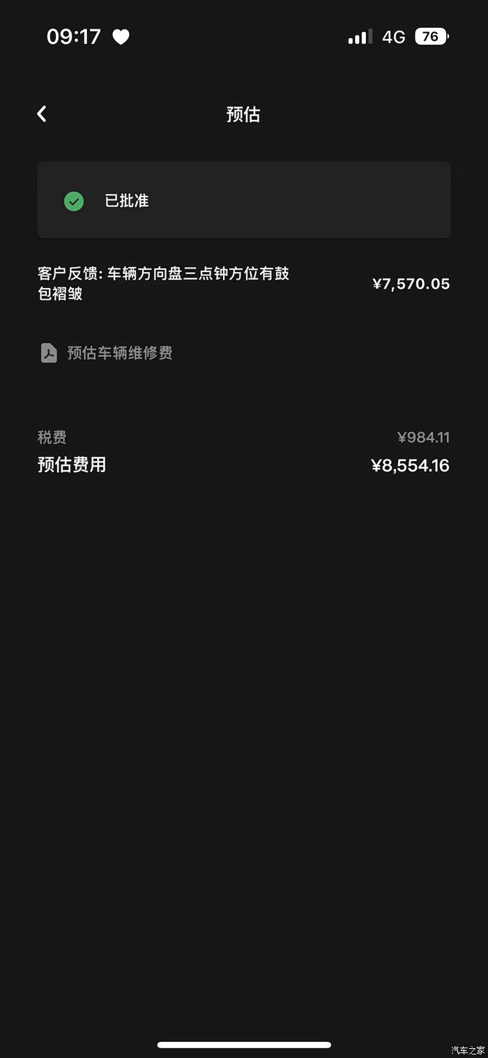 提交售后申请后,系统会自动预估每个项目的费用,单独更换一个方向盘和人工费用约为8000多元。