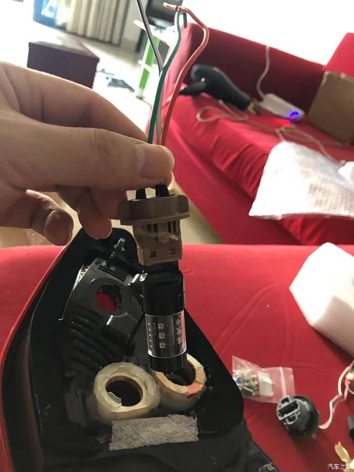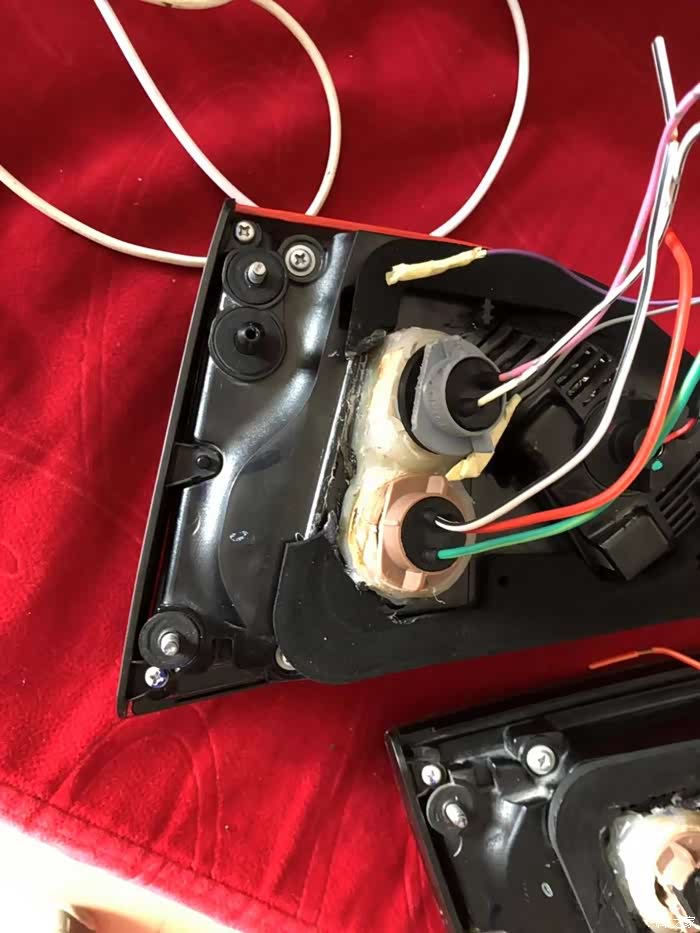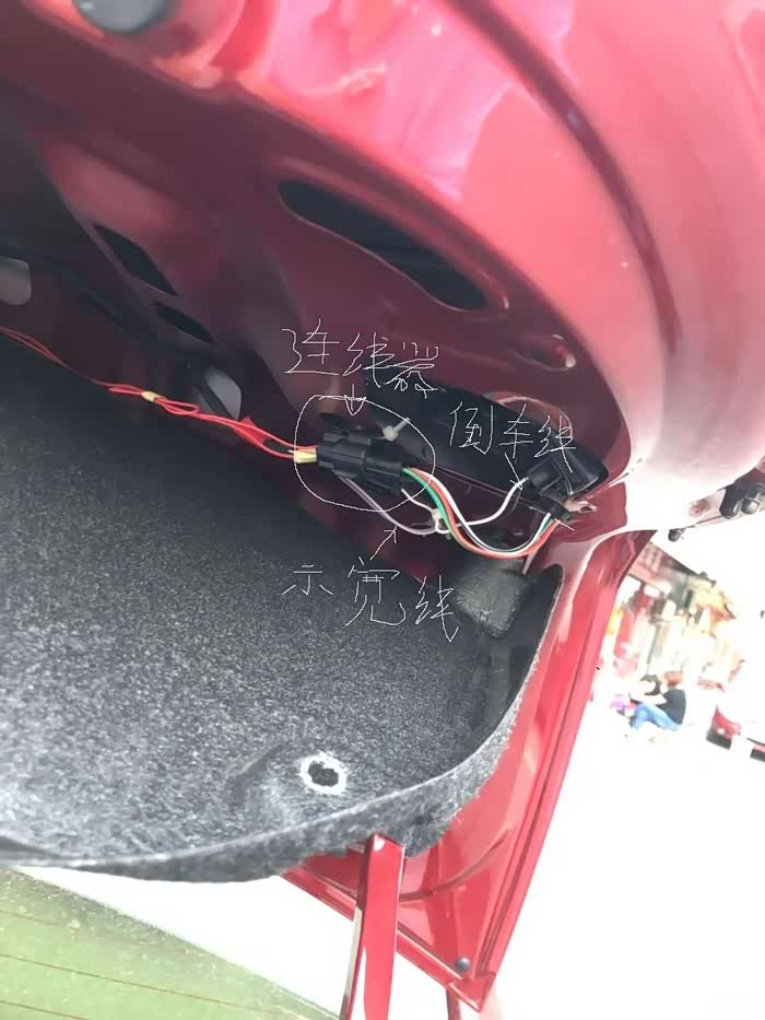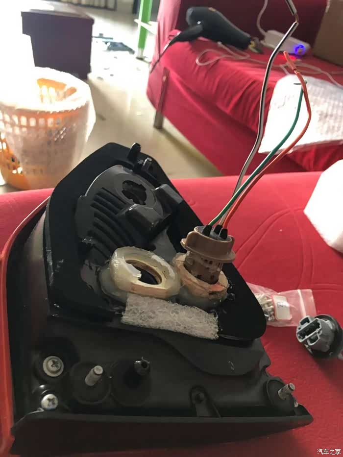 原示宽灯座剪掉,接在接线器上,另一头接新灯座。左边也一样。左边加装的倒车灯线,从这里接过去。图中有两根红色的,一根是刹车线,一根是倒车线