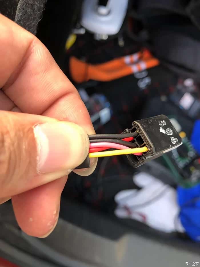 原装接线器,这是有刹车灯的,红色是刹车线,粉色是示廓灯,黄色是转向灯,黑色是负极。