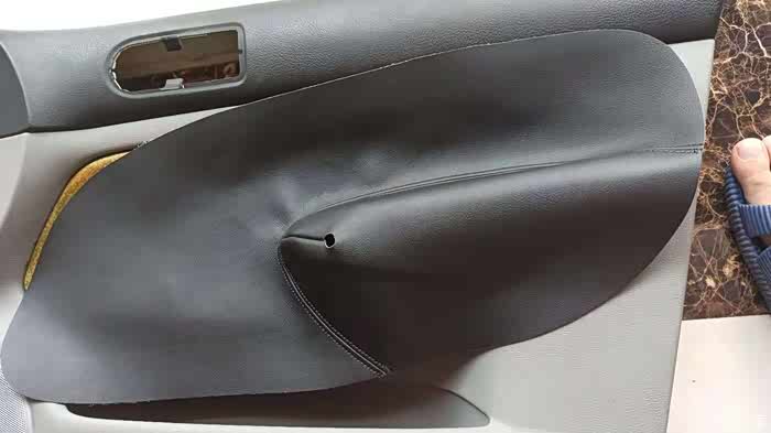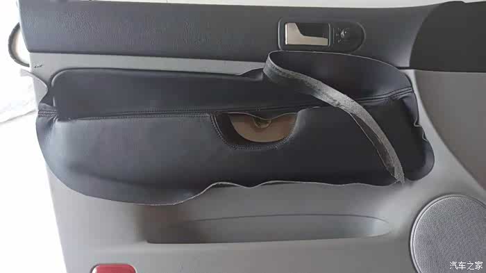 安装好的眼镜盒,整体比较满意,虽然从下午2点多到夜里11点多,期间有2个多小时主要调整胶条和顶棚之间的位置缝隙,虽然很累,但看到如新车般的顶棚,成就感满满,在此特别感谢媳妇上新顶棚时的耐心帮忙。当时打算换顶棚时,对更换门饰皮很犹豫,但看到脱落的门皮时,再次下定决心,换,上网购买了黑色黑线的的,主要考虑到耐脏,不到100元。上图。