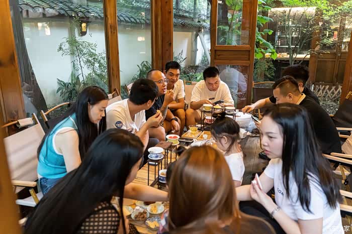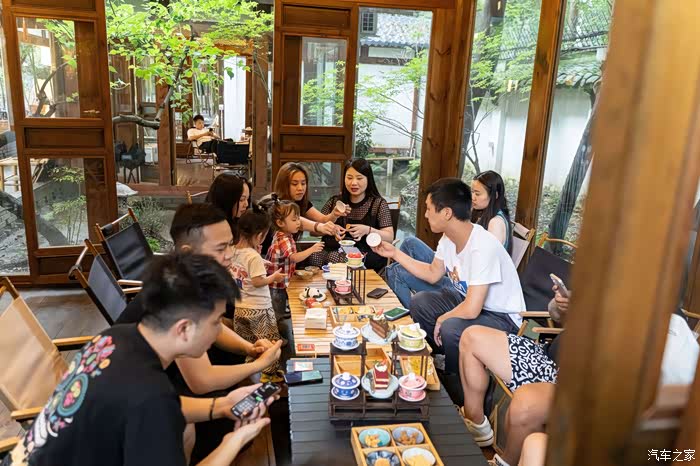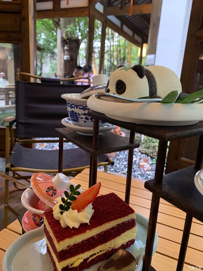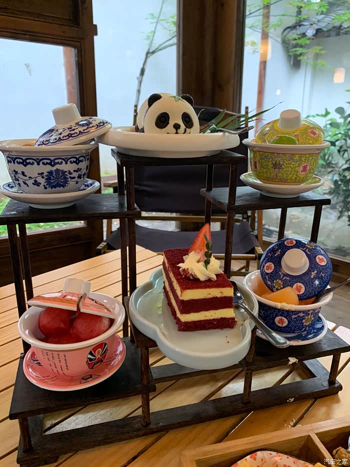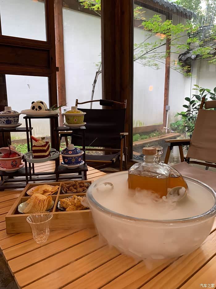 这次活动举办地在沏嚯茶,估计谐音四川话的去喝茶。环境布置古香古色,时不时还会喷点仙气出来。虽然成都已进入华西秋雨的时间,但八月的尾巴来一套夏季围炉冰茶也不错。国宝熊猫慕斯憨态可掬可爱至极,口味也很不错。红丝绒咸奶油蛋糕口感不错,盖碗水果盲盒,很有创意。四宫格小吃还行吧。冰萃茶庄在围炉冰蓝端上桌的时候仙气飘飘,精致有趣。跟奥迪品牌体现精致生活的调性很搭。