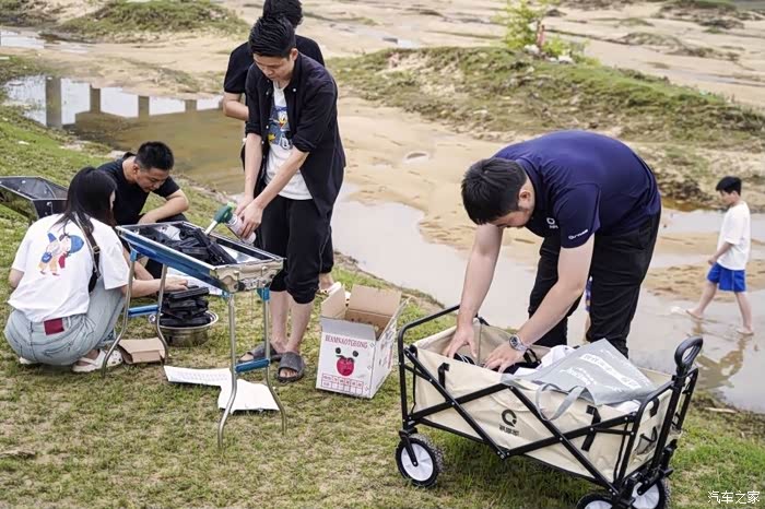 简单的插曲过后,大人们找合适地方搭棚扎寨,着手准备烧烤,娃娃们自行玩水。装备是真的多,食材和礼品是真的丰富,加上搬运要跋沙涉水,花了不少时间。
