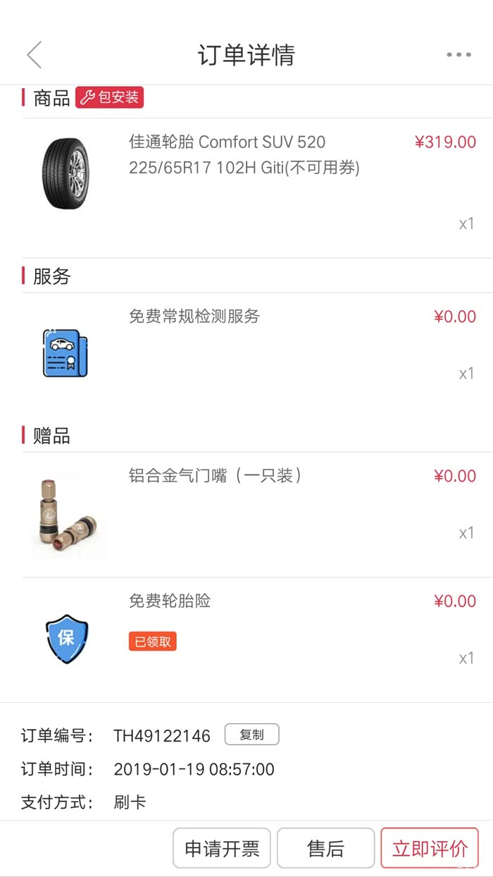 两周前的一个凌晨二点多开着小七行驶在深圳郊外正在施工没有路灯的平龙路,一不小心撞上了路边的马路牙子,右前胎就这么爆胎报废了,爆的补都补不了那种!只能喊上朋友一起帮忙换上备胎先应急,由于工作太忙,前天才抽出时间在途虎养车app上下单订购了一条佳通轮胎,一直都用这佳通轮胎,性价比实在是美丽。当时途虎就立即从武汉东西湖发了德邦物流,昨下午就收到信息轮胎已到旁边300米的东莞雁田途虎养车工场店!物流相当给力,今天一早就迫不及待的驱车赶往途虎工场店去安装,接待的师傅非常热情,而且根据实际情况帮我优先安装了更换,师傅相当操作娴熟,半个小时搞定,并帮忙把备胎归位,还帮忙清了故障码,个人体验非常满意!在当今的网络时代,很欣慰有途虎养车走在时代的前列,让更多车主得到了实惠和便利!