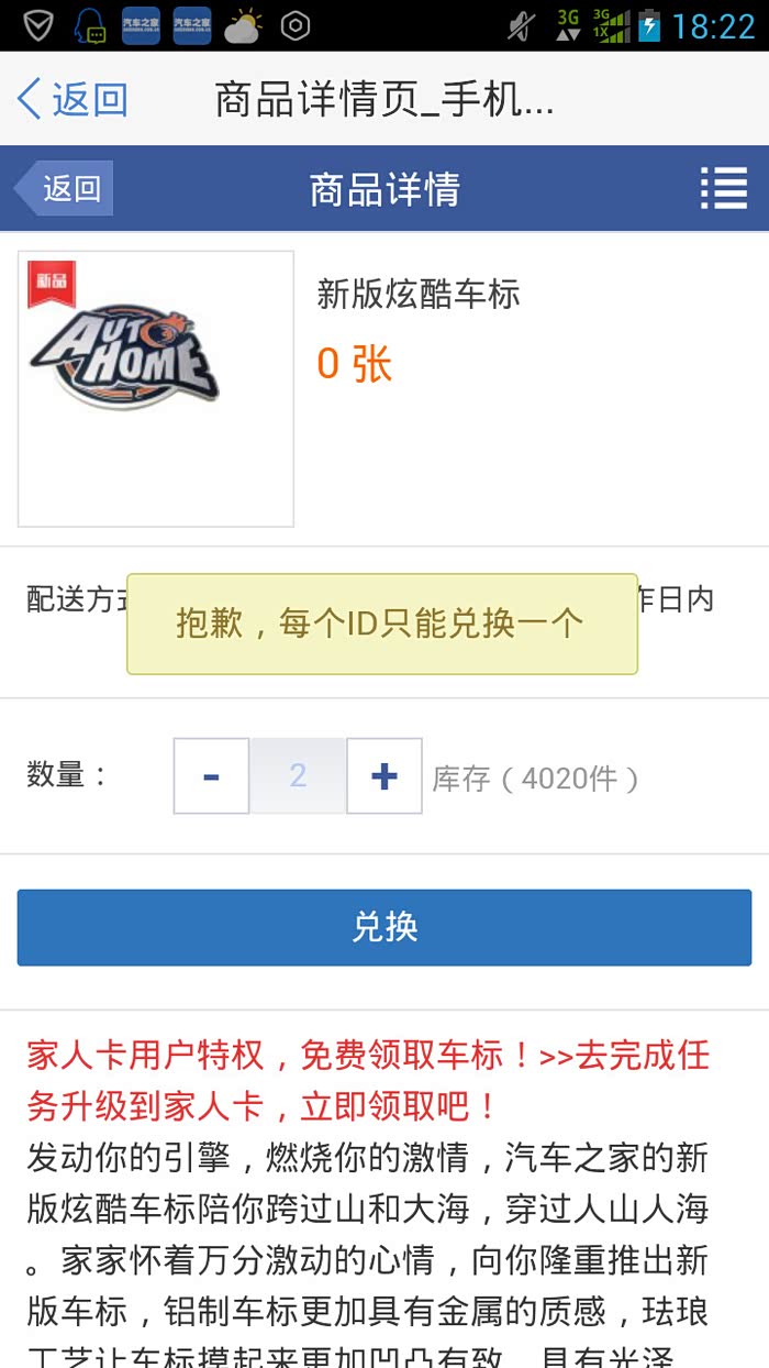 商城商品免费兑换,(特定商品)之家会不定期的上线商品,并放在兑换商城中,只要有家人卡(铜卡及以上)的朋友们都可以“0”家油券直接兑换。例如这次的“新版炫酷车标”就是其中一样商品。特殊商品限时限量免费领。