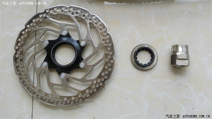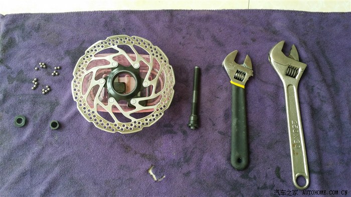 拆解还是比较顺利的,拆后轮花鼓时,飞轮锁盖是比较紧的,且需用到上图最下方的专用工具,而前轮的碟片锁盖只需稍加用力即可。