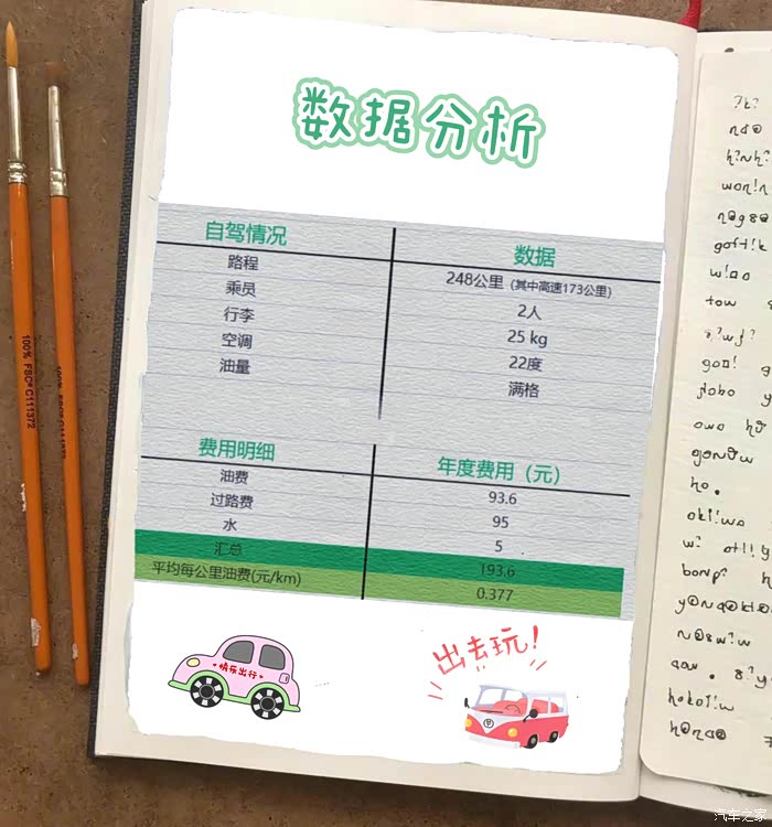 如果按这个油耗算,这这248公里下来,也就11.7L油(248*4.7/100=11.7L),那么油费就是93.6元(11.7*8.0=93.6元)。