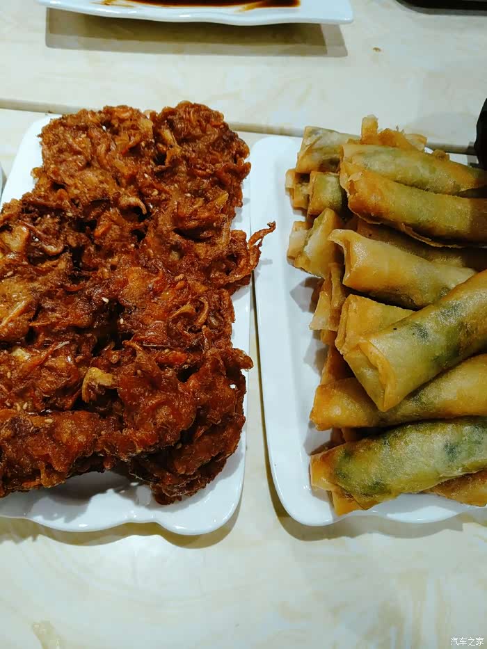 虾饼、春卷,两道纯手工制作的半菜半主食。还没开吃前,现炸现吃。