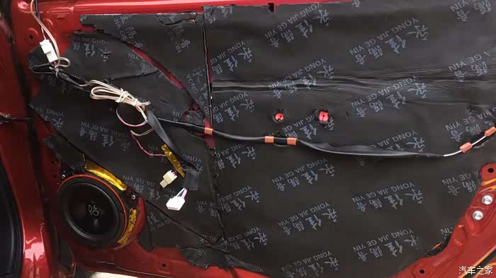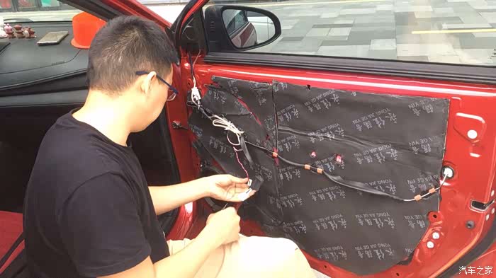 车门里面已经贴了一层止震板,现在是在外层加三合一的止震板。