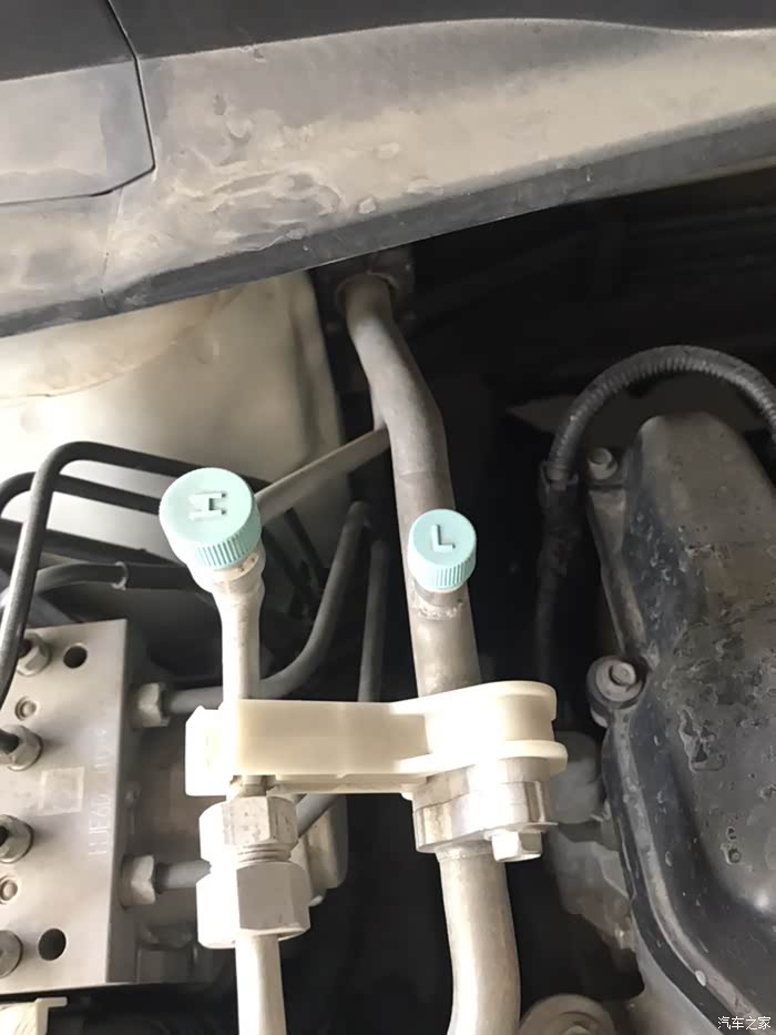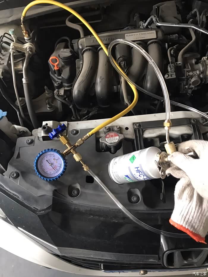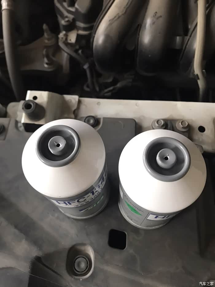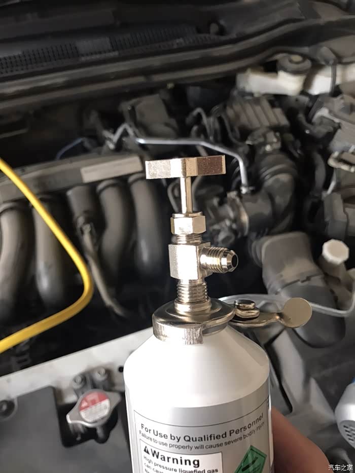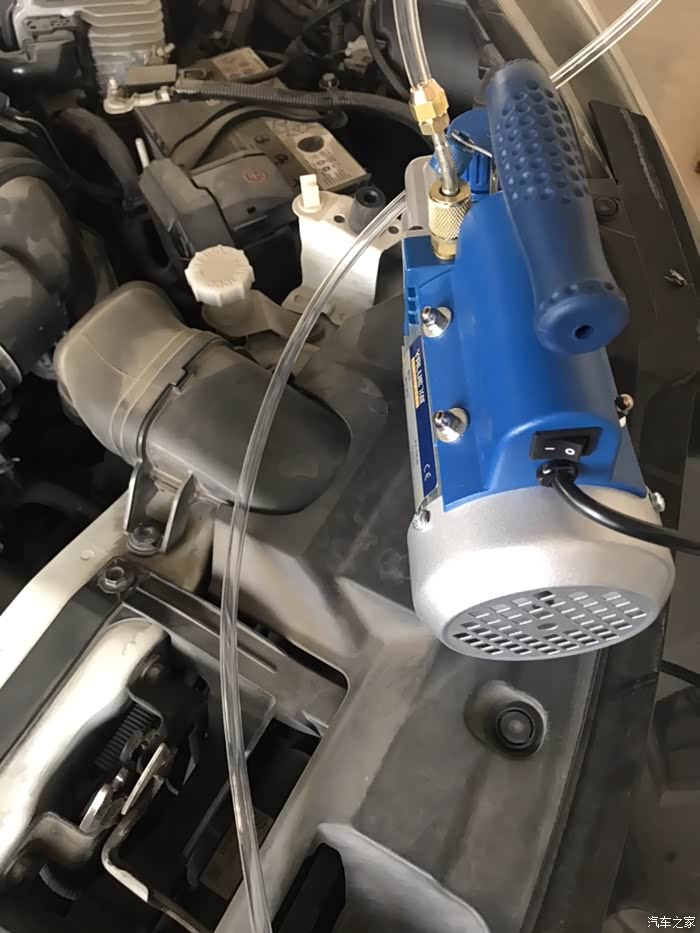 打开前机盖,准备放掉原车制冷剂,目前只能换制冷剂试一试。