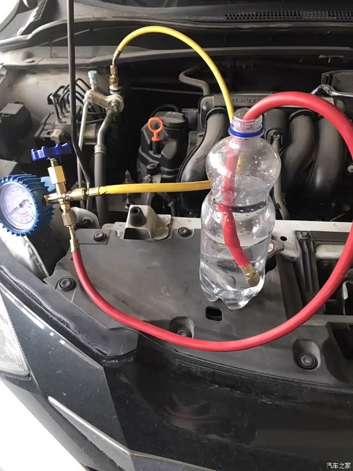 链接好管路开始放原车制冷剂,出气孔加一个瓶子,里面放上水,像水烟袋一样,拿水缓冲一下,尽量减少压缩机油的损耗。