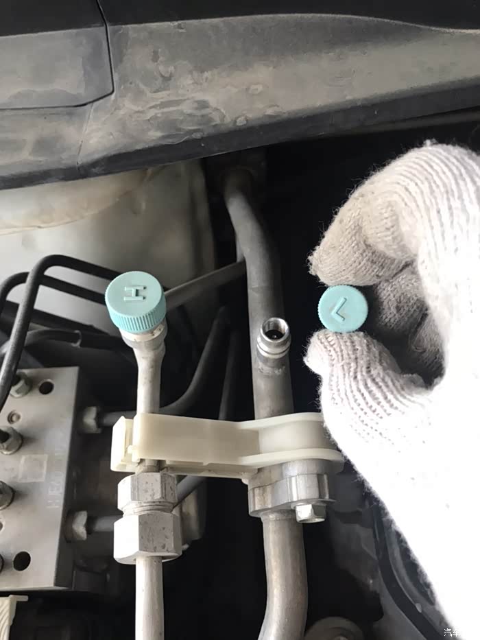 H是高压管,L是低压管,我手里就一套低压表,所以咱只拧开低压,从低压管放原车制冷剂。