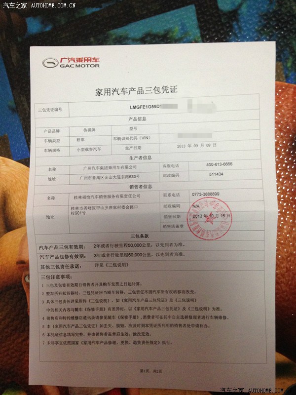 大概过了半个月左右,听说国庆桂林甲天下广场举办车展,内心的躁动又开始了,又是软磨硬泡说服老婆去桂林看车展,40多分钟的高速准备到达桂林市区,途径一段路有几家汽车4S店,现代 日产 福特等,因为车展这些品牌肯定会有就不必麻烦一家家去看了,突然看见一个好大的车标,(桂林传祺4S店门口的车标巨大过路的车辆瞎子都能看见 0.0!)因为前段时间在汽车之家还是某网站看过关于GA3的***,当时只是顺便看看,也没引起我特别的注意,反正当时就是心里想着进去看看吧,车展可能没这个品牌。就抱着这样的心态进去了桂林福怡4S店,不去还好一进去就不得了啦,当时一进门一辆崭新的闷骚红色GA3摆在进口的位置,在展厅里和GA5 GS5一起显得格外耀眼,当即就喜欢上了, 问这问那价格也在我接受范围内,问老婆怎么样,老婆说还好,要不先等车展看看先吧。