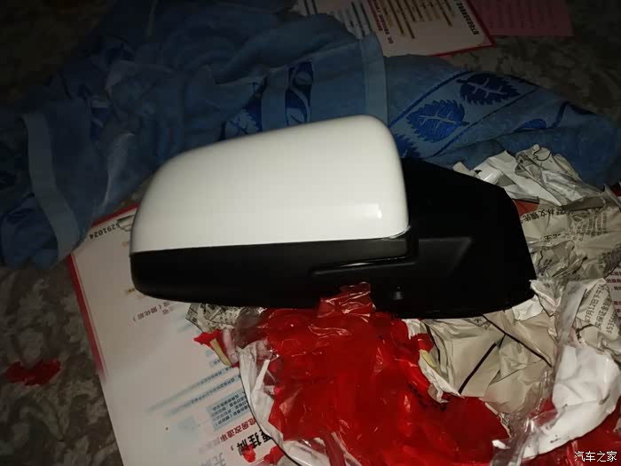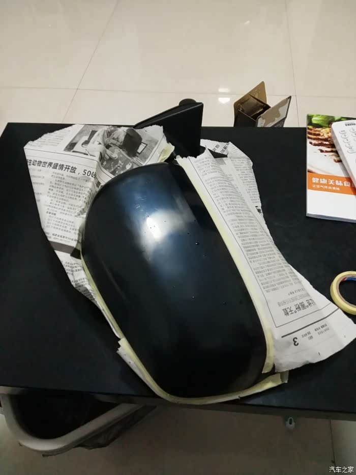 网上买的原厂电动后视镜,素色不带漆,美纹纸和报纸包好准备喷漆