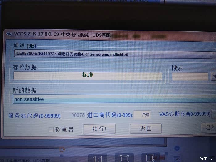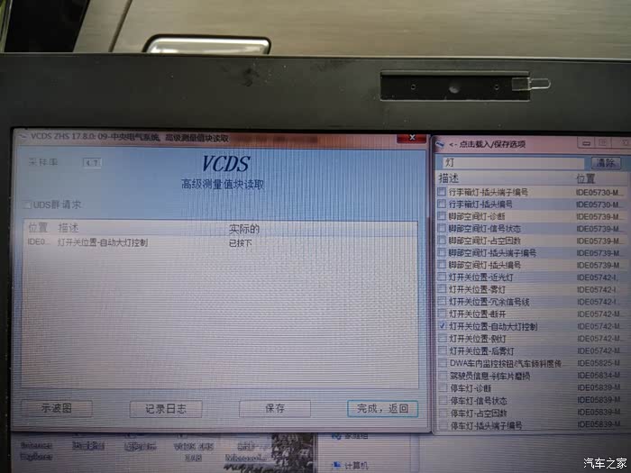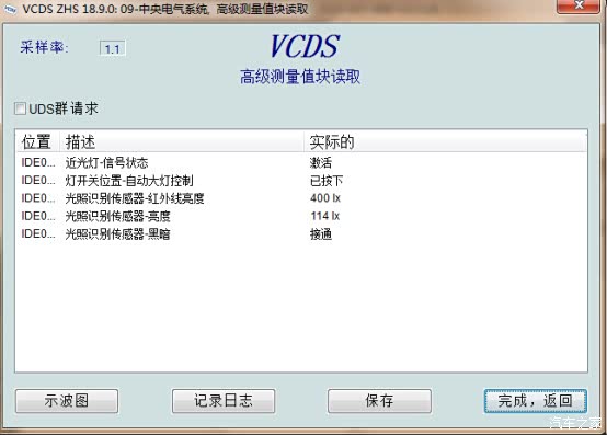 这个方法有坛友发过,但具体值多少合适?我的设置是减为原厂值十分之一,依据是网上查了成都市路灯开启是按照120lx(单位为勒克司)设置。以下截图为给广大车友参考,又升级vcds,又在阴天环境下截图给大家参考