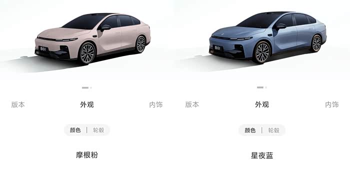 盲订阶段专属「摩根粉/星夜蓝」外观 +「幻月紫/纤云灰」内饰配色选择。
