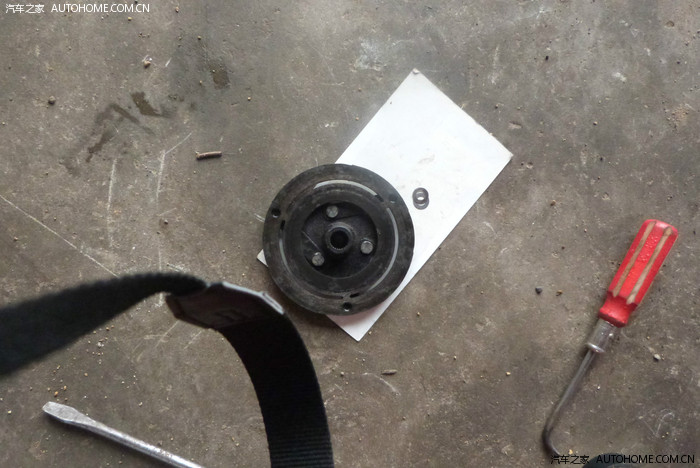 压缩机由两根螺丝固定,下端可以顺利取出,上端抽不出来,有车架妨碍。(这一点不如捷达,捷达设计的更合理),我用手砂轮将螺丝杆切断后取出。后配一根10*120的高强度钢螺丝,正好装上。