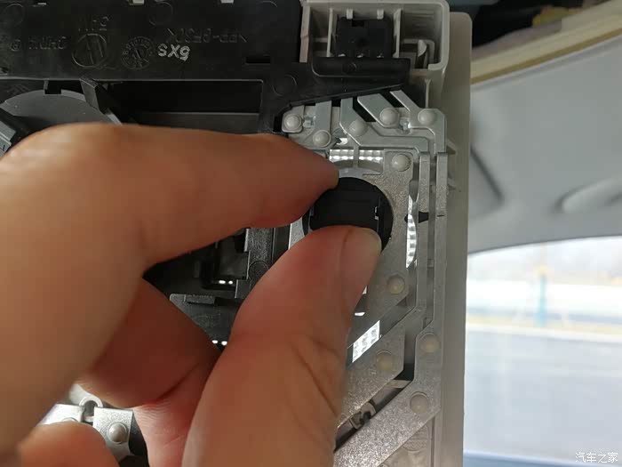撬开最里面两个塑料卡子后,用手拿住阅读灯面板,向外一拉,整个阅读灯面板就拆卸掉了。