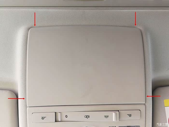 阅读灯面板卡扣位置。在这4个位置撬很容易拆卸掉阅读灯面板。(我只撬动了上面两个箭头指示的位置,阅读灯面板就拆掉了。有疑惑的车友可以继续往下看帖子。)
