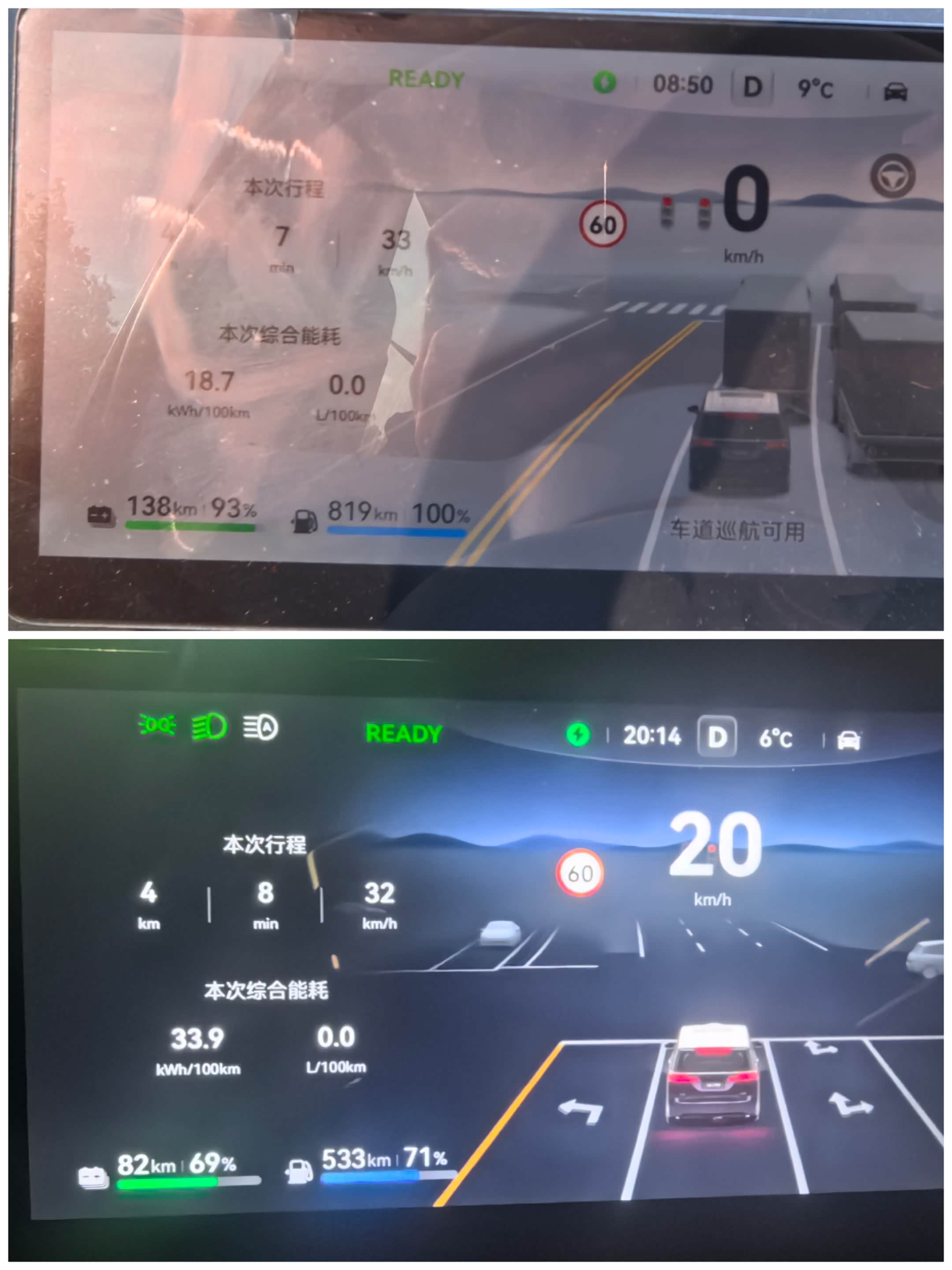 像这种情况,提前预热后,短途通勤全程无需额外开暖风,除非要长途行驶,短途通勤状态下,纯电续航能多跑20公里很轻松,下图就是能耗对比,在温度相近的情况下,前几天一早一晚接送孩子上学放学的短途实测,上图有点反光,同样4公里的路程,平均时速几乎一致,温度相差3度,但不会对能耗差这么大