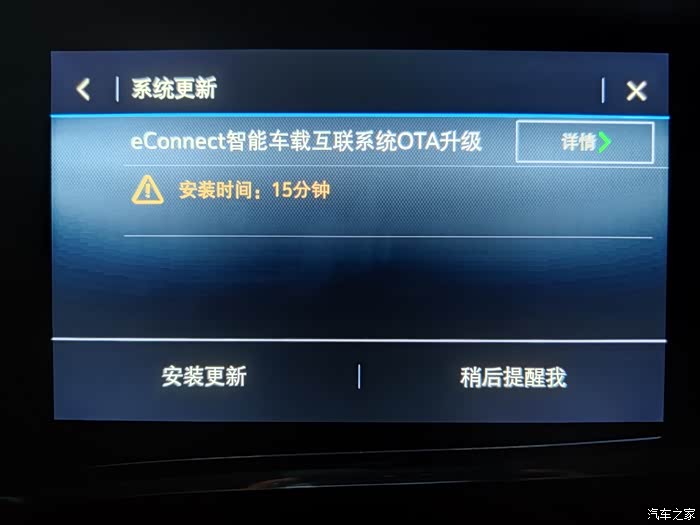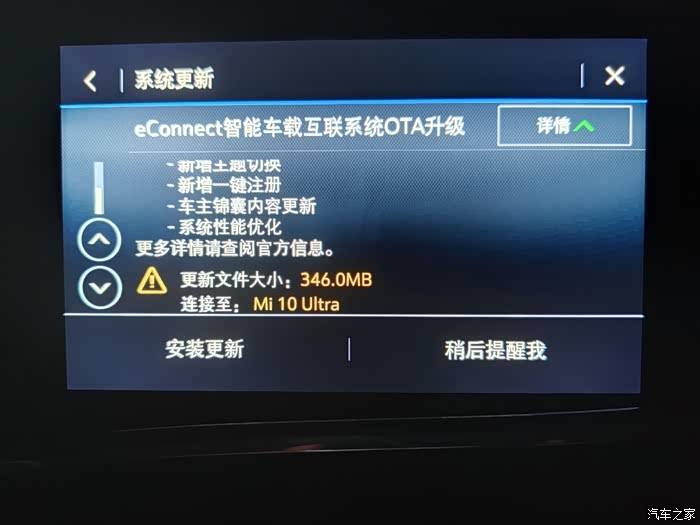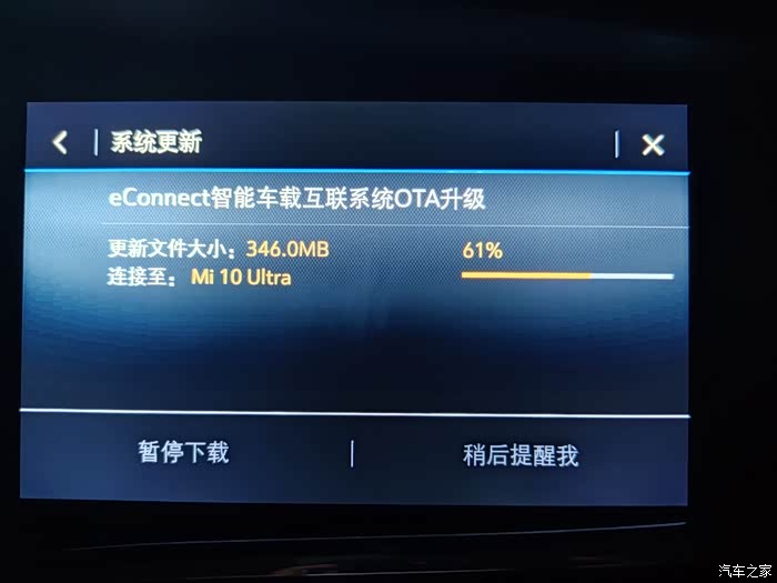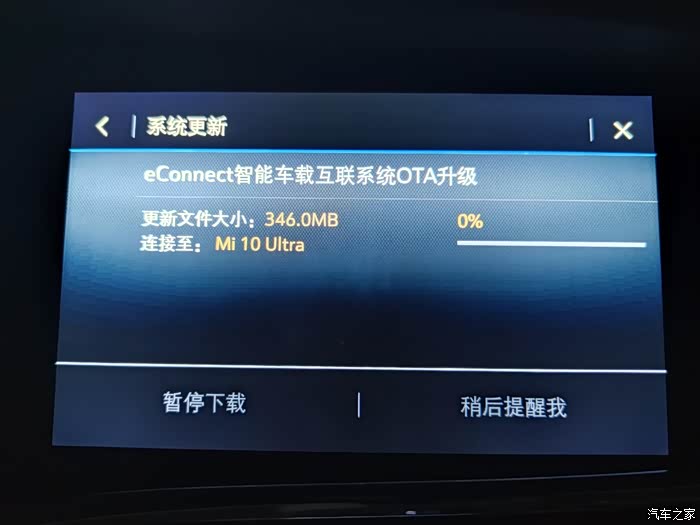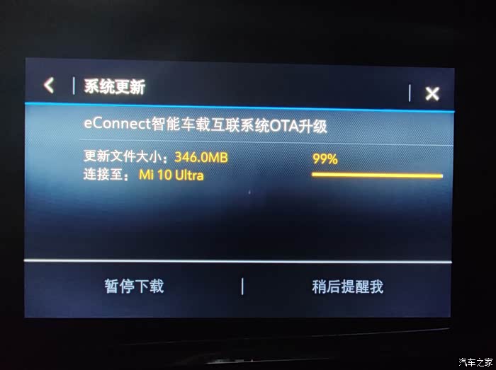 2021年3月2日晚,在设置里手动搜索可用升级程序,发现可以OTA升级了,随即进行了升级,将车辆网络由连接安吉星更改为连接手机热点后,346MB的升级程序包下载的很快,用时7分钟。