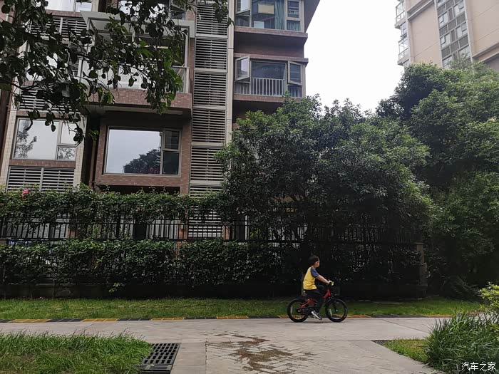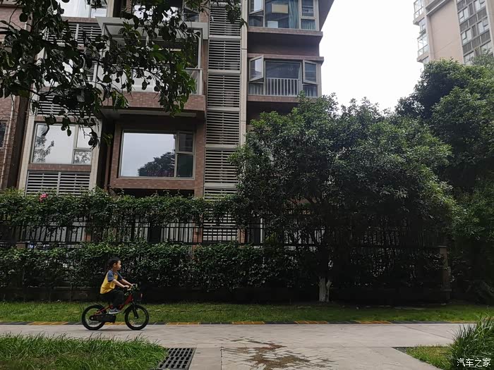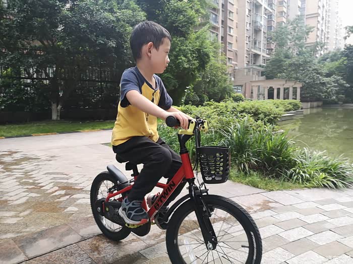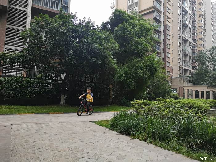 星期天小家伙在小区里骑自行车。