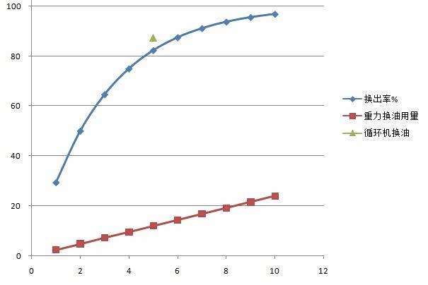 其实重力换油与循环机换油的差异并不大, 如果同样用12升新油,重力换要操作5次,纯度82%,循环机换纯度87%。(绿色三角表示)。