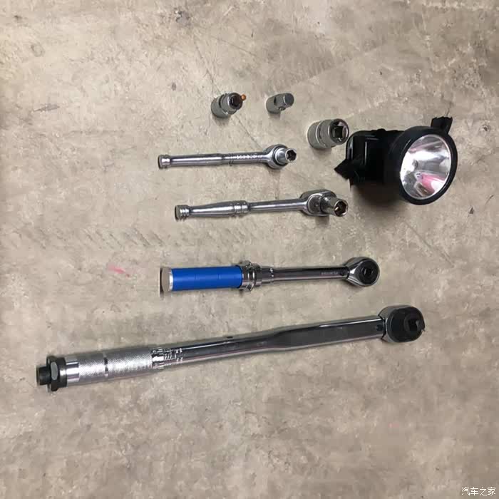 24套筒加长柄扳手, 用长柄可以减小推力,因为汽车顶起来了, 人在车下, 用的力气越小越好。