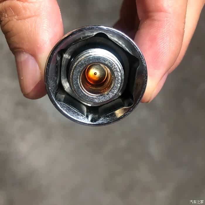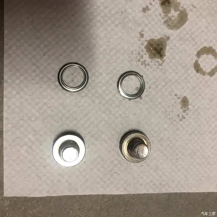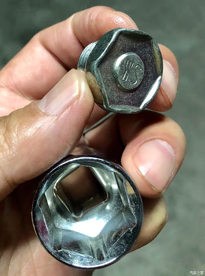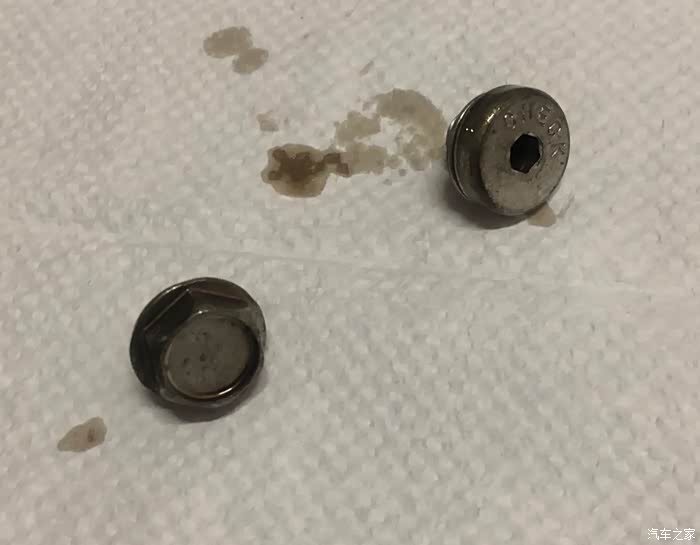 拆下的溢油塞和放油塞,大小一样, 区别是拧松它们的工具不同, 这是防呆设计。