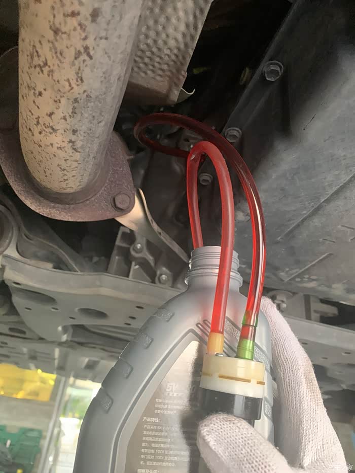 。每次操作都是先钻到车下放油,再加油到溢流口溢出, 然后装上溢流塞,再多加1.4L进去(不要超过1.4L,不然加油口可能会溢油), 然后爬进车里点火,挂挡,让油混合,熄火。