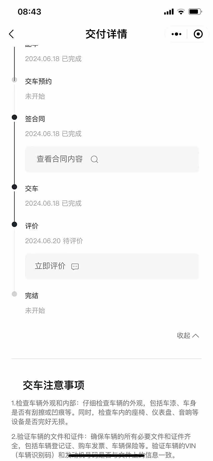 2024年6月15日那晚出价格,第二天一早,店方又邀,就跟媳妇去了,店里正好放了五台现车,都是白金黑内的,4S也是个性,或者说厂家新出的,就给这个配色?也好,正好跟媳妇想要的内外颜色差不多,媳妇又说,一趟一趟的来的麻烦,趁又现车,直接定了吧!so……
