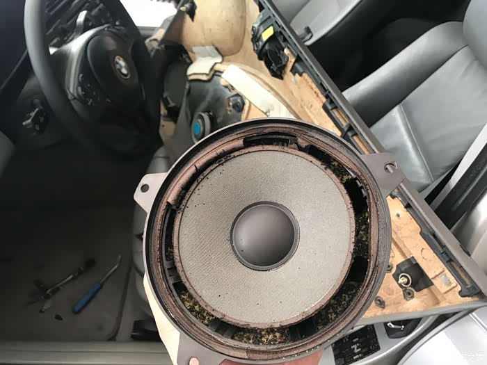 E46刚到家,我就发现它的音响系统有严重的杂音,最开始我以为是CD机头的原因,这东西很便宜,实在不行就换了,结果在拆悬挂的时候意外发现后窗台上的扬声器折环居然没了。
