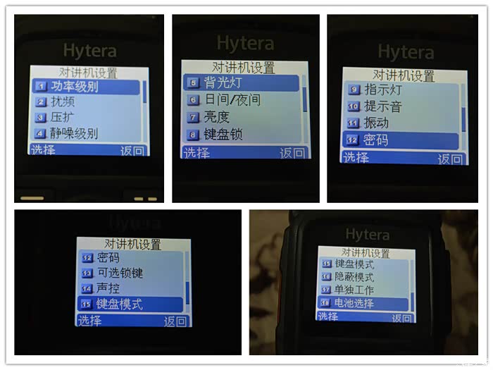 对讲机设置内容最多,模拟频道有18种设置。分别为,功能级别、扰频、压扩、静噪级别、背光灯、日间/夜间、亮度、键盘锁、指示灯、提示音、振动、密码、可选锁键、声控、键盘模式、隐蔽模式、单独工作、电池选择。