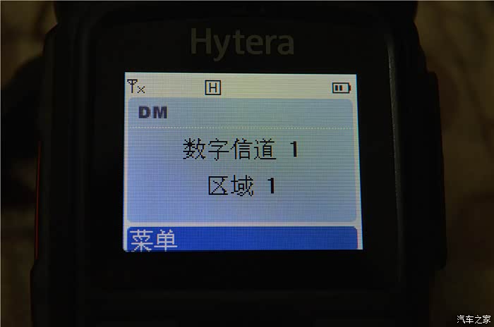 开启模拟信道时,屏幕中央提示当前的信道号,区域数。顶部左边为类似手机信号的标志,右边为电池电量。DM代表对讲机处于常规模式,如果为TM则表示处于集群模式。右下角为菜单选项。