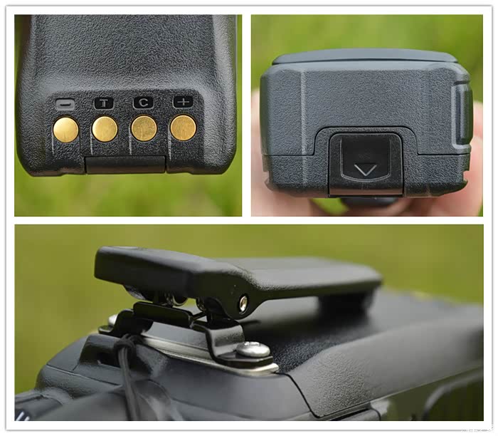 对讲机的充电接口、拆卸电池卡扣、皮带夹细节,这里要提的是,皮带夹是很机身连在一起的,拆电池就不用下掉皮带夹,很多牌子的皮带夹很电池固定在一起,要拆一起拆,很不方便。这一点,海能达做的很人性化。
