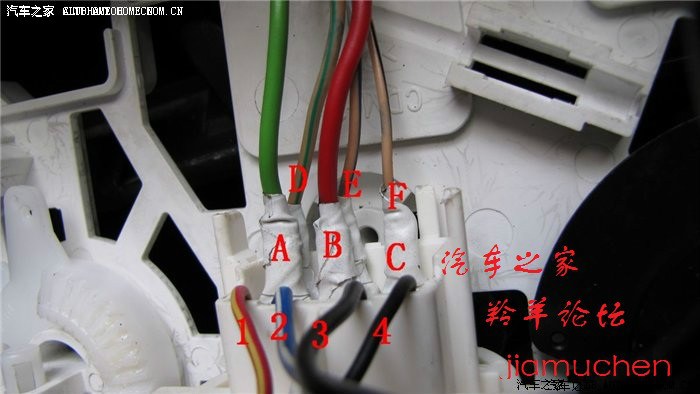 新羚羊控制器一共有10个接线柱(6个大接线柱,4个小接线柱)。A接风机12V供电电源线,B接风机4档风力的打铁线,C空着不接,D接3档打铁线,E接2档打铁线,F接1档打铁线。1接夜间照明灯供电线,2接原来空调AC开关上的压缩机控制线,3接空调AC开关指示灯的打铁线,4接夜间照明灯的打铁线。