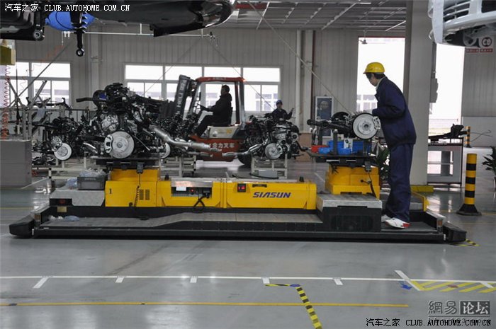 黄色的是AGB的无线小货车,通过红外线感应全自动运行。帝豪所需要装配的动力总成、悬挂、刹车、排气管、前后桥,全都放在这个小车上。与流水线上的车身保持自动沟通,会根据车身的位置自动驶入车身底部,车速与车身保持一致。到一定工位后自动举升,然后由工人安装部件。