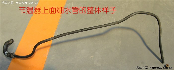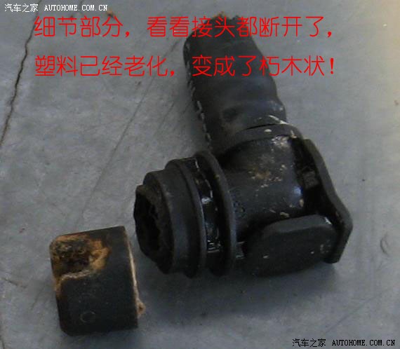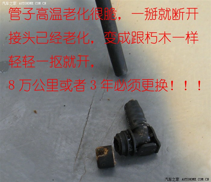 我是09年第一批车,2012年12月左右发现小水箱的水位下降了,冷车的时候水面离小水箱底部大约1CM这么高,检查了一下发现节温器上面的细水管稍微有点渗水,就没在意,直接在市场买了一瓶普通2升红色的防冻液补充了进去大约1升左右,近期发现小水箱的水位又下去了,发现节温器细水管处渗水有加多的迹象,赶紧去4S检查,被告知这根水管因为高温高压,已经完全老化了,必须马上更换,已经不能再开了,否则很危险,还好4S仓库有现货,立即开单更换。拆下来真的发现老化很严重塑料跟朽木很相似,用手指轻轻一抠就开了,管子已经很脆了,轻轻一掰就折断了,真是万幸啊,没有坏在路上!!!