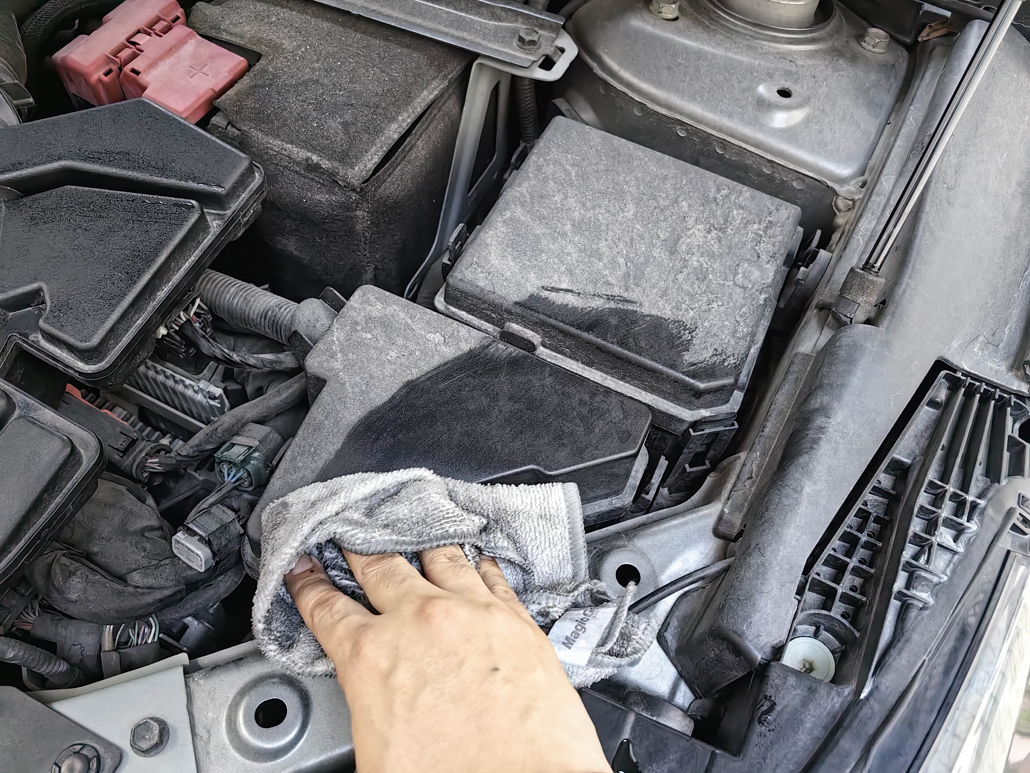 我一般不在洗车店清洗发动机舱,自从有一次让他们洗一下直接拿着高压水枪对着线路冲,我就觉得不怎么靠谱还是自己来,自己操作就可以简单一点,用湿毛巾擦干就可以。