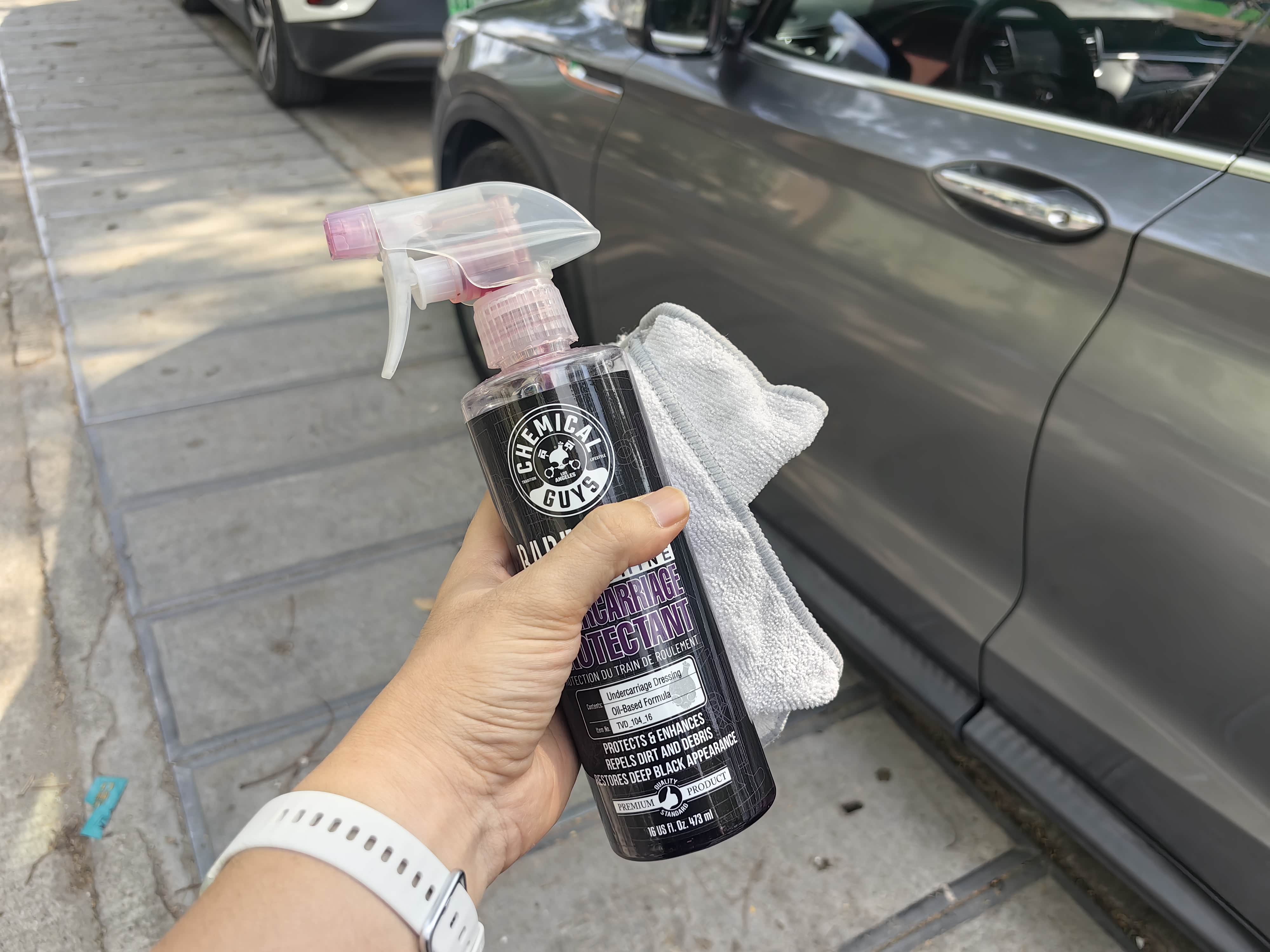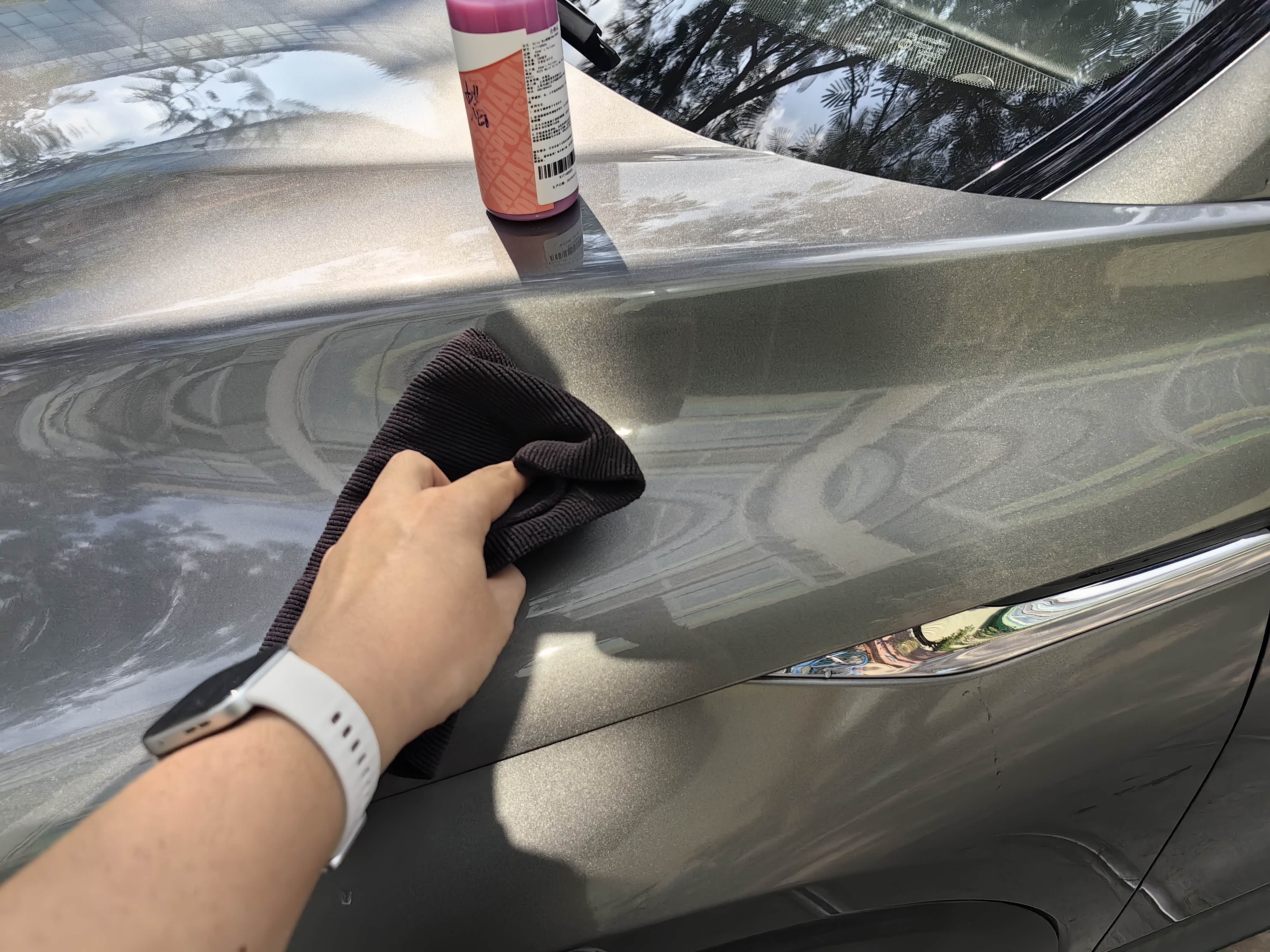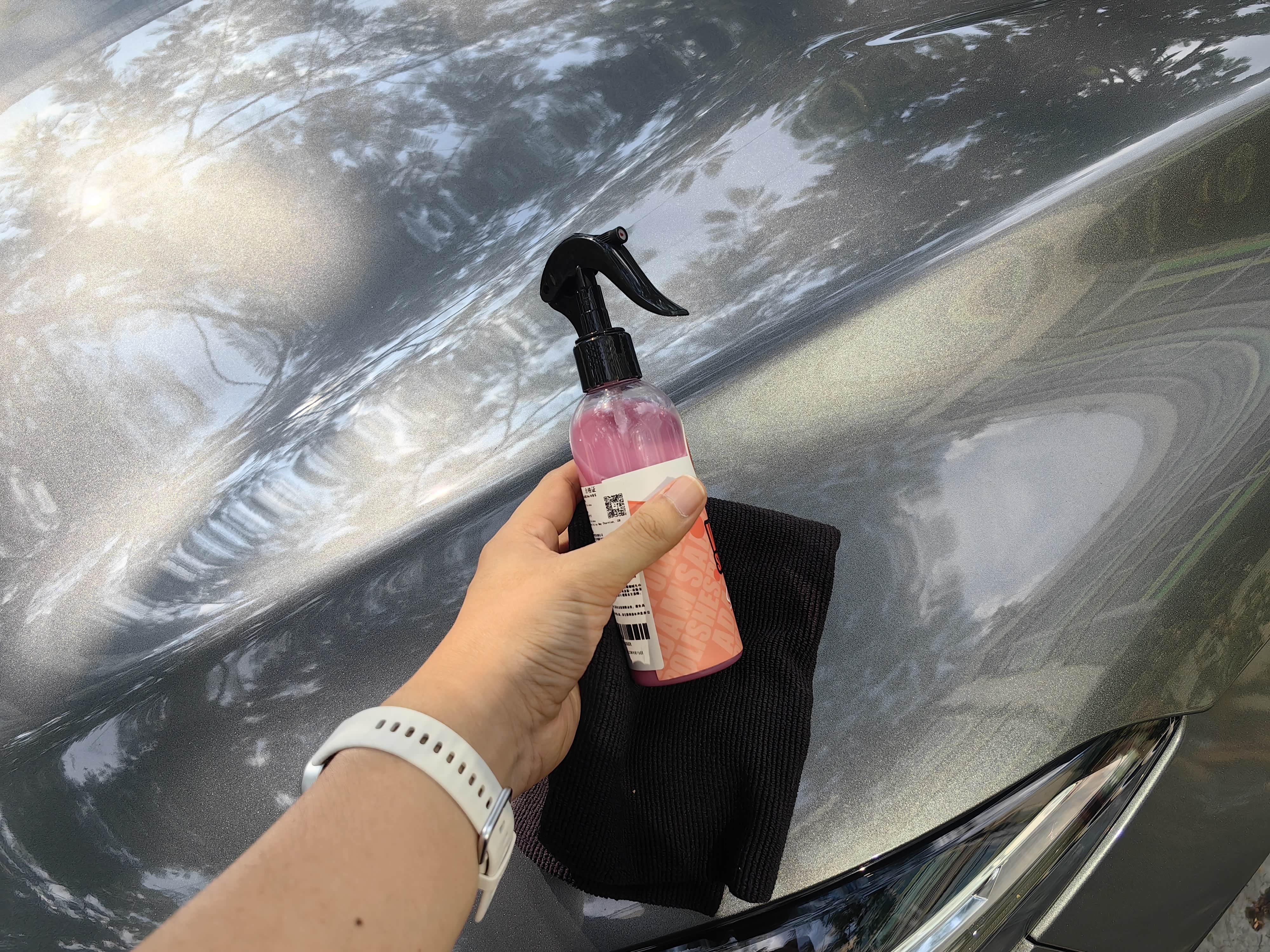 洗完车趁着没有灰尘自己动手打蜡。现在为了方便都用液体喷蜡,一一擦就搞定,非常方便,为了避免广告嫌疑,就不具体介绍品牌了,网上一搜各种都有。